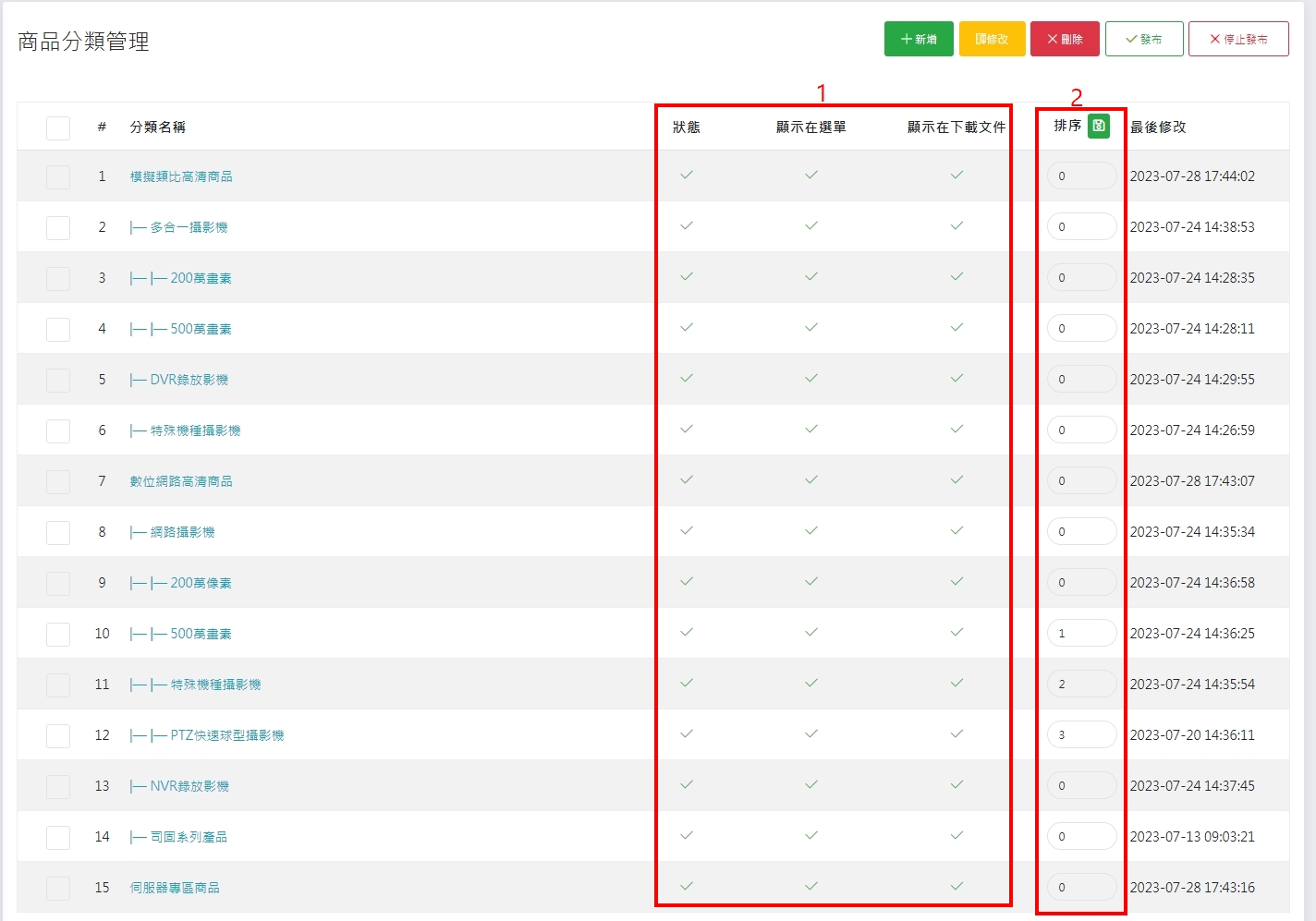 - 發佈狀態: 是否啟用此分類,啟用才可在增加商品時進行分類的設定