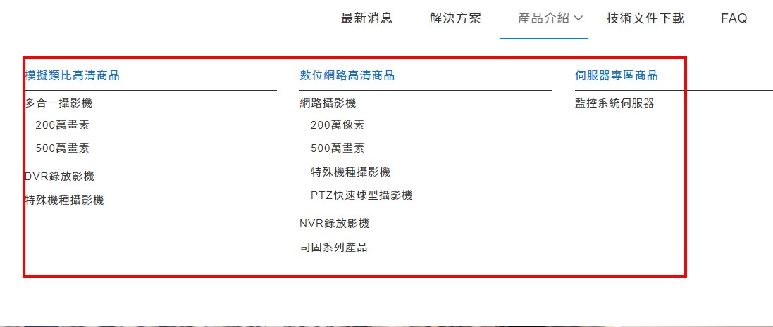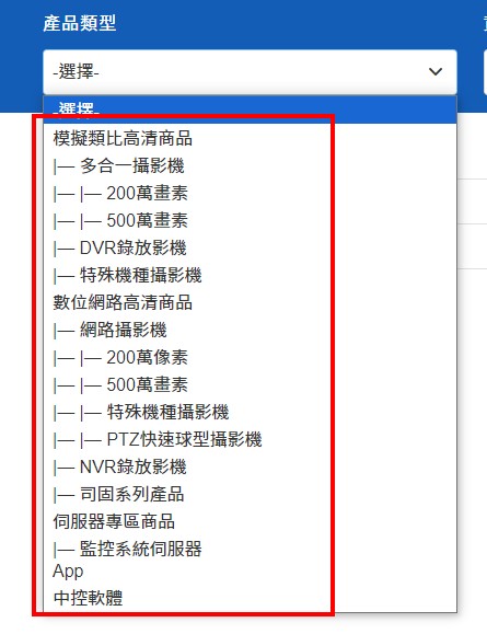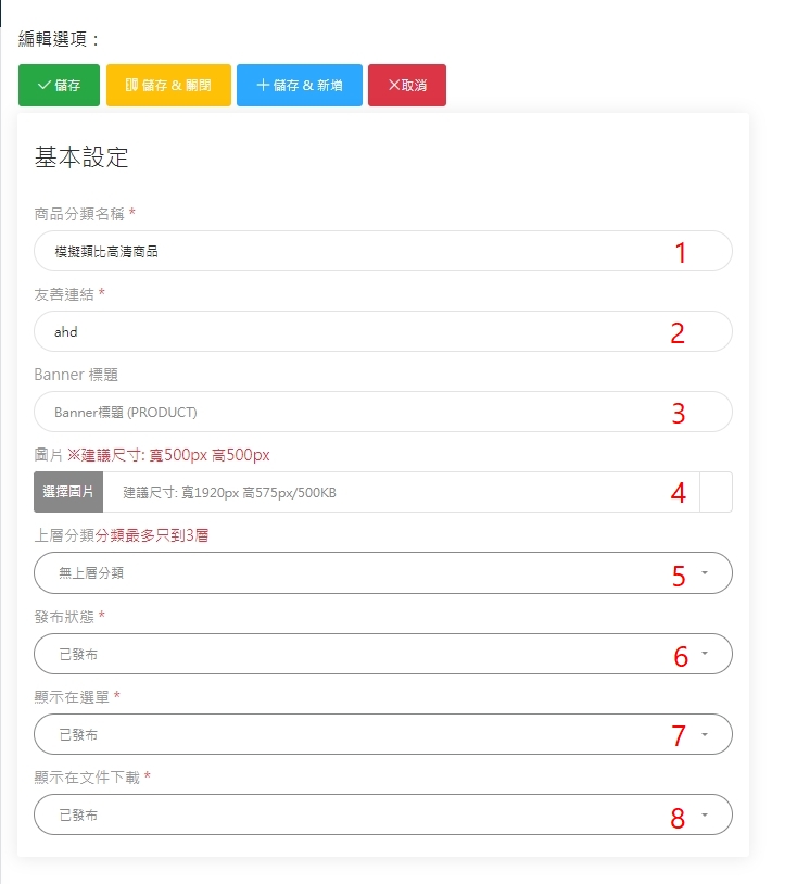 - 商品分類名稱: 顯示在前台選單或技術文件下載內頁的產品類型內