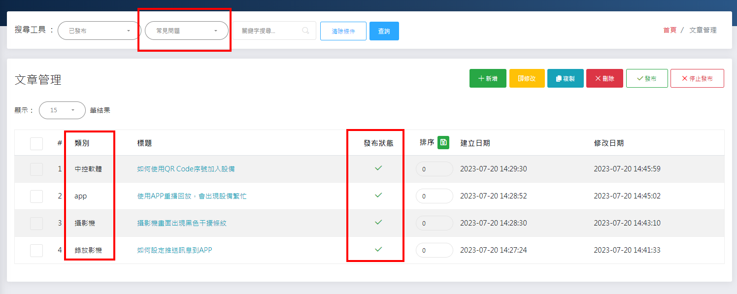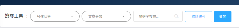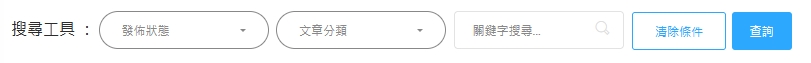 列表搜尋工具 每個列表上方根據資料條件不同 顯示不一樣的搜尋條件 根據所有下拉選項與關鍵字內容共同組合成一個特定條件來篩選資料 [操作方式] EX:在文章管理上方的搜尋工具,我們設定搜尋條件,並點選藍色按鈕「查詢」 搜尋「已發布」且為「常見問題」分類下的文章 我們可以看到下方出現的搜尋結果