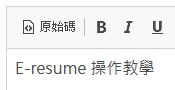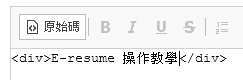 編輯器功能列 最左邊的「原始碼」功能 點選後進入編輯器html輸入模式 在此模式下可以輸入html 編輯文章 恢復正常編輯器模式 會顯示html編輯後前台看到的樣式 [操作方式] 使用編輯器編輯文章後,記得按下「儲存」或「儲存&關閉」或「儲存&新增」! 文案設計才會更新喔!