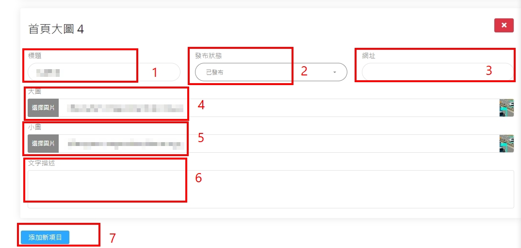 首頁大圖管理 首頁大圖管理內頁 標題:會顯示於前台大圖上,如下圖圈起處 發布狀態:前台是否顯示此張大圖 網址:非必填,若填寫,前台點選此張大圖連至該網址 大圖:點選「選擇圖片」,挑選顯示於"電腦"前台的大圖 小圖:點選「選擇圖片」,挑選顯示於"手機"前台的大圖 文字描述:非必填,若填寫會出現於前台大圖內,如下圖圈起處。 添加新項目:增加大圖 [操作方式] 填寫資料後,記得按下「儲存」或「儲存&關閉」或「儲存&新增」,才會新增大圖喔!